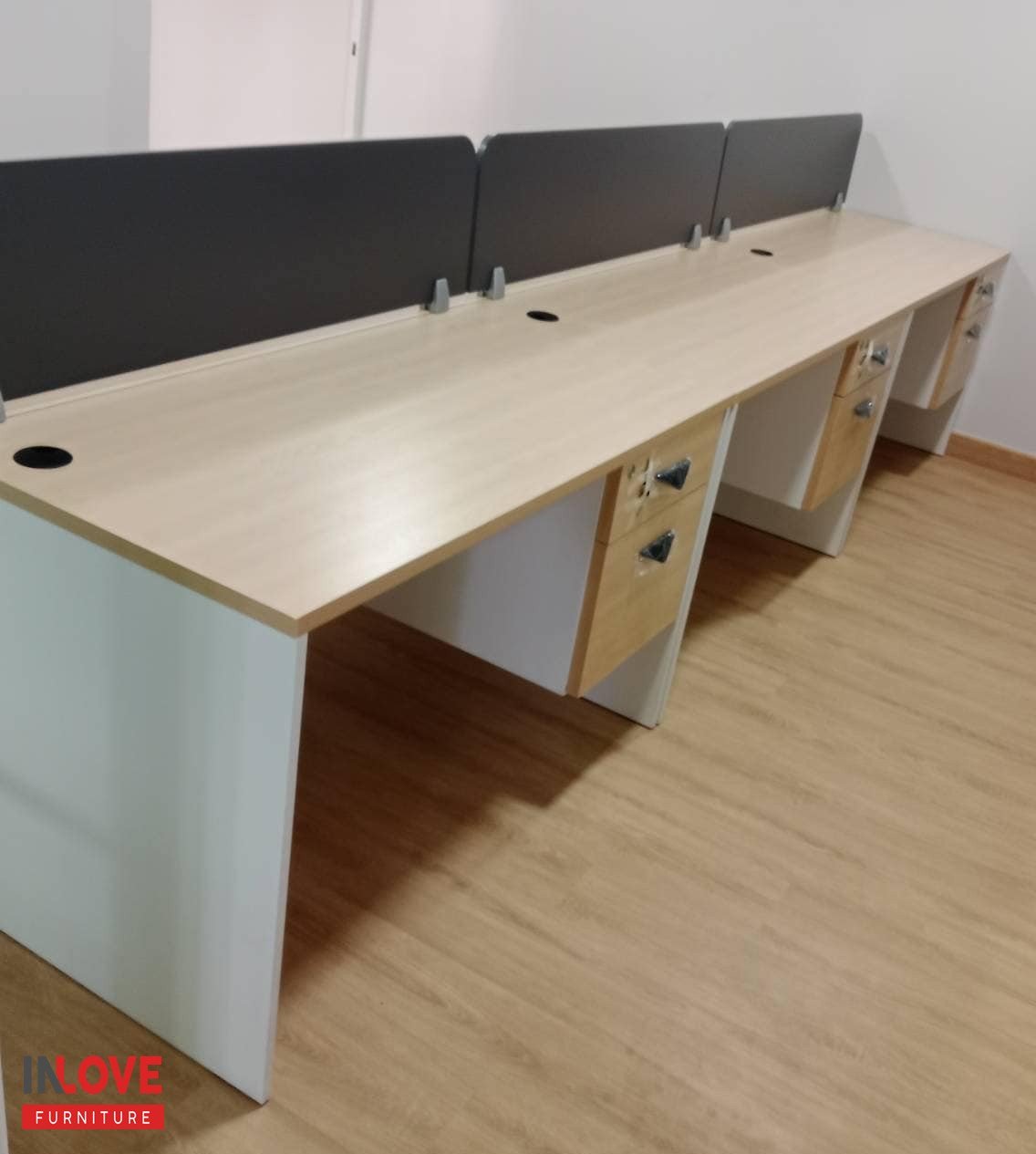 โต๊ะทำงานกลุ่ม + พาร์ติชั่นกั้นด้านหน้า และ ด้านข้าง ขนาด 340x120x75 ซม สีเมเปิ้ลขาว